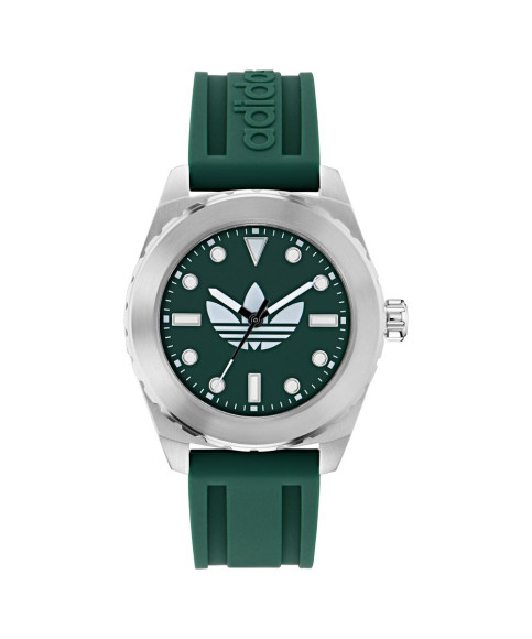 Introducing the Adidas Originals® Analogue 'Discoverer One' Unisex's Watch AOSY25022, a timepiece designed for those who appreciate both style and functionality. This watch features a quartz movement that ensures precise timekeeping, coupled with an eye-catching green dial that beautifully contrasts with the stainless steel of its 44mm round case. With a case thickness of 12mm, this watch comfortably fits all wrist sizes, proving that practicality can go hand in hand with modern design. The watch is water-resistant up to 5 bars, making it suitable for everyday wear and outdoor adventures alike. The band's green silicone material adds a sporty touch and provides both durability and comfort, measuring 21cm in length. Its 21mm width comfortably secures with a traditional buckle clasp, ensuring the watch remains securely on the wrist during all activities. Weighing in at only 79 grams, the Discoverer One is lightweight, making it ideal for daily wear without compromising on style. Designed for both men and women, this versatile watch offers a blend of contemporary aesthetics and classic performance. With the Adidas name, you can trust the quality and craftsmanship that comes with this timepiece. Every element of the Discoverer One reflects a commitment to excellence and an understanding of modern lifestyles. It's more than just a watch; it's a statement of innovation and design.Shop Adidas Originals AOSY25022 at Ormoda