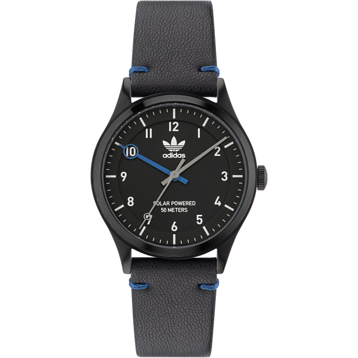 The Adidas Originals® Analogue 'Project One Steel' Unisex's Watch AOST23046 is an epitome of modern craftsmanship and timeless style. Designed for both men and women, this watch exemplifies versatility with its sleek, casual aesthetic. The watch features a robust black stainless steel case with a diameter of 39mm and a thickness of just 8.5mm, ensuring it sits comfortably on the wrist without compromising on durability. The black dial, protected by mineral glass, brings an elegant contrast to the stainless steel casing, enhancing its sophisticated appearance. Powered by a reliable quartz movement, this watch promises precision and accuracy in timekeeping. The analogue display is not only functional but adds a classic feel, making it suitable for both everyday wear and special occasions. The watch is equipped with a comfortable black leather band, measuring 20cm in length and 19mm in width, secured with a sturdy buckle clasp. With a water resistance of up to five bars, the 'Project One Steel' is designed to withstand splashes and brief immersion in water, making it both a practical and stylish choice for any lifestyle. Weighing only 48 grams, it feels light on the wrist while still being a significant accessory. The combination of the durable materials and thoughtful design makes this timepiece an essential addition to any collection, showcasing the perfect blend of Adidas' sporty heritage and contemporary elegance.