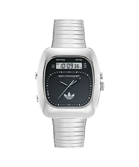 Introducing the Adidas Originals® Analogue-digital 'Retro Wave Three' Unisex's Watch AOSY25013, a stylish and modern timepiece that perfectly blends functionality with contemporary aesthetics. This watch features a unique rectangular case made of durable stainless steel, colored in a sleek silver tone that exudes elegance. With a case diameter of 37mm and a thickness of just 10mm, it offers a comfortable yet robust design suitable for any wrist. The stunning black dial is enhanced with an easy-to-read analogue-digital display, making it not only a fashionable accessory but also a practical addition to your collection. It features a day-date calendar function, ensuring you stay organized and in control, no matter your schedule. The plexiglass window guarantees resilience against scratches while allowing for a clear view of the dial. Equipped with quartz movement, this watch delivers accurate timekeeping, which is essential for those who value punctuality. The silver stainless steel band is not only visually appealing but also comes with an expanding bracelet clasp, providing comfort and adjustability for all-day wear. With a band length of 20cm and width of 19mm, it easily fits various wrist sizes. Designed to withstand water up to 5 bars, the Adidas Originals® watch is perfect for both casual daily wear and more adventurous activities. Weighing just 80 grams, it feels light on the wrist, making it a versatile choice for unisex styling. Whether dressing up for a formal event or keeping it casual on the weekends, this timepiece is an ideal companion that represents adidas' commitment to quality and style.Shop Adidas Originals AOSY25013 at Ormoda