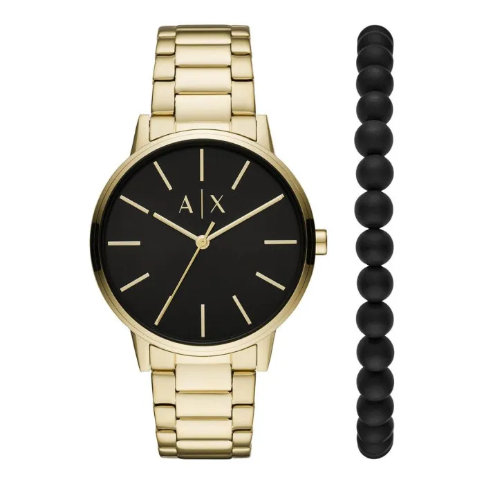 Introducing the Armani Exchange® Analogue 'Cayde' Men's Watch AX7119, a perfect blend of style and functionality. This timepiece stands out with its striking gold stainless steel case, measuring 42mm in diameter and just 7mm thick, providing a modern aesthetic without compromising comfort. The black dial contrasts beautifully against the gold tone, offering an elegant yet casual flair. This watch is designed for the man who appreciates quality and sophistication in his everyday wear. The mineral glass adds durability, ensuring clarity in all conditions while complementing the watch's refined look. The Cayde features a steadfast quartz movement, promising reliability and accuracy. The gold stainless steel band, measuring 21cm in length and 20mm in width, exhibits both robustness and style, making it suitable for various occasions. It secures comfortably around the wrist with a fold-over clasp with a push button, marrying convenience with sophistication. With a water resistance of up to 5 bars, you can wear this watch with confidence, knowing it can handle daily adventures. Whether you're at work or out for an evening, the Armani Exchange 'Cayde' is an ideal companion. It epitomizes the modern man’s spirit, combining classic watchmaking techniques with contemporary styles. Designed for versatility and everyday wear, this watch doesn't just keep time; it represents an attitude, a reflection of your personal style that speaks volumes without saying a word.Shop Armani Exchange AX7119 at Ormoda