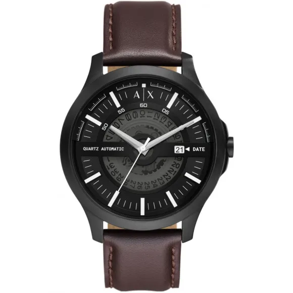 The Armani Exchange® Analogue 'Hampton' Men's Watch AX2446 is a striking representation of the brand's commitment to innovative design and superior craftsmanship. This watch seamlessly combines casual elegance with modern functionality, making it an essential accessory for the contemporary man. The bold black stainless steel case, measuring a robust 46mm in diameter, exudes confidence and strength. At a thickness of just 11mm, it offers a streamlined profile that sits comfortably on the wrist. Beneath the mineral glass dial lies a profound black surface adorned with clean markers that enhance readability in any light. One of the standout features of this piece is the automatic movement, providing reliability through a fine blend of traditional watchmaking art and modern innovation. The casual aesthetic of the Hampton is beautifully complemented by its brown leather band, which measures 21cm in length and 22mm in width. This band secures with a classic buckle, ensuring a snug fit for all-day wear. Not just a stylish addition to your wardrobe, the watch also includes a date calendar function, making it a practical companion for every occasion. It is rated to withstand water pressure of up to 5 bars, ensuring that minor splashes won’t hinder its operation. With a total weight of 80 grams, this sleek accessory integrates comfort with an undeniable sense of style, appealing to any modern man's taste for quality and sophistication.Shop Armani Exchange AX2446 at Ormoda