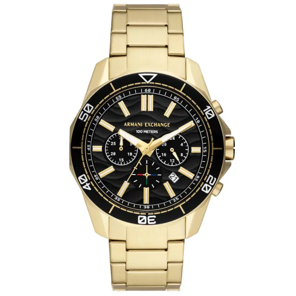Meet the Armani Exchange® Chronograph 'Spencer' Men's Watch AX1958, a masterpiece in both aesthetics and functionality. Famed for its blend of luxury and performance, the Spencer series embodies the spirit of modern masculinity. Crafted from high-quality stainless steel, the watch features a gold case that captivates with its bold 44mm round diameter. This diver-style watch is designed for the man who appreciates both adventure and sophistication. Its sleek black dial contrasts beautifully with luminous hands and numbers, ensuring visibility in any lighting, whether you're diving into the depths or making a statement while on shore. One of its standout features is the turnable bezel, which not only adds to its distinctive look but also enhances its practicality. The chronograph display offers functionality, allowing you to keep track of time with precision through the intricate stopwatch mechanism. At a thickness of 13mm, it strikes the perfect balance of presence without being cumbersome. To top it off, the watch is water-resistant up to 10 bars, making it ideal for those who lead an active lifestyle. The band is equally striking, sporting a luxurious gold stainless steel finish with a length of 21cm and a width of 21mm, designed to comfortably fit around any wrist. The fold over clasp with a push button ensures a secure yet stylish wear. Not only is this watch a reliable companion for the adventurous spirit, but its timeless design makes it a versatile addition to any wardrobe, suitable for both casual outings and formal gatherings. The Armani Exchange 'Spencer' is not just a timepiece; it’s a statement of style, functionality, and durability that aligns perfectly with the modern man’s lifestyle.