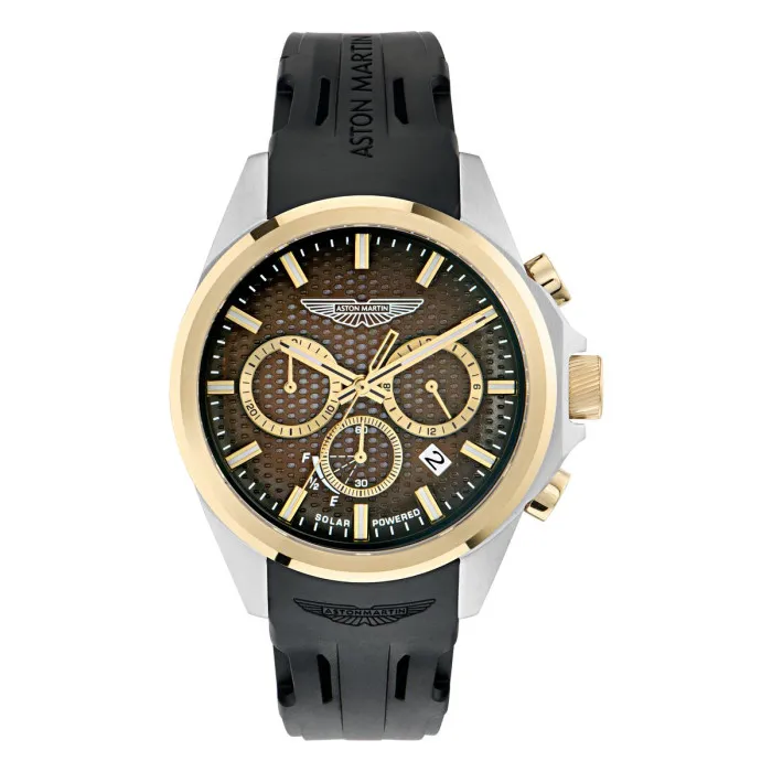 The Aston Martin® Chronograph 'Thrill Hlc W' Men's Watch MTRH2S605 is a statement of sporty elegance and precision. With a striking 44mm round case crafted from stainless steel, it promises durability and a polished appearance that resonates with the powerful brand, Aston Martin. The bold brown dial, protected by mineral glass, complements the robust aesthetics of the watch. Luminous hands ensure visibility, even in dim lighting, making this timepiece a reliable companion for both day and night occasions. At the heart of this exceptional watch lies a precise quartz movement, ensuring accuracy and low maintenance. The black silicone band not only adds comfort but also durability for everyday wear. Measuring 21cm in length and 21mm in width, it features a reliable buckle clasp that fits securely around the wrist. As for functionality, this chronograph watch includes a date calendar and multiple features such as a stopwatch and a solar-powered mechanism, highlighting both innovation and practicality. The watch is rated for 10 bars of water resistance, making it suitable for swimming and other water activities. With a thickness of 14mm, the watch carries a distinctive presence without being overly bulky, appealing to the man who values both style and substance. Designed for the modern gentleman, the Aston Martin® Chronograph 'Thrill Hlc W' combines sleek design with practical functionality, establishing itself as an essential accessory for any refined wardrobe.Shop Aston Martin MTRH2S605 at Ormoda