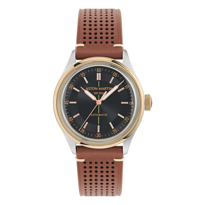 The Aston Martin® Analogue 'Timeless Ts1' Men's Watch MTTS1S604 epitomizes the fusion of luxury and performance, a true reflection of the iconic British brand. With a case crafted from durable stainless steel, its 39mm round design and 14mm thickness offer a perfect balance of elegance and robustness. The striking black dial is protected by mineral glass, ensuring longevity while enhancing clarity for easy readability. This watch does not merely tell time; it is a statement on your wrist, affirming your taste in fine craftsmanship and timeless design. The watch features an automatic movement, providing precision at every tick, a trait that aligns with Aston Martin's dedication to excellence. Complementing its striking dial is a beautifully designed brown leather band. Measuring 21cm in length and 19mm in width, it boasts a comfortable fit secured by a reliable deployment clasp, ensuring it stays in place during any occasion. With a water resistance rating of up to 10 bars, this watch is built for adventurous spirits, ready to accompany you from business meetings to weekend escapades without losing its sophisticated charm. The slick profile combined with attention to detail makes this an ideal choice for the modern man who values both functionality and style. Experience the sophistication and precision that only Aston Martin can offer with the Timeless Ts1. This is not just a watch but a legacy you can wear on your wrist.Shop Aston Martin MTTS1S604 at Ormoda