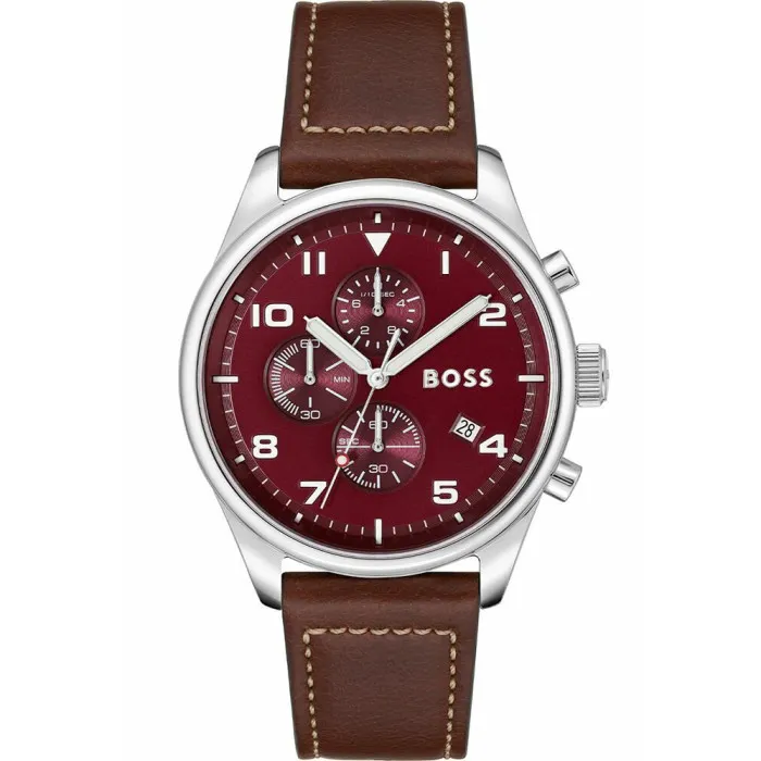 Introducing the Hugo Boss® Chronograph 'View' Men's Watch 1513988, a striking blend of style and precision that embodies the essence of contemporary masculinity. The watch features a remarkable red dial that captures attention with its boldness, while the stainless steel round case ensures durability and elegance, measuring 44mm in diameter and just 11mm thick. Underneath the striking exterior lies a reliable quartz movement, guaranteeing accuracy in every second of your day. The carefully crafted mineral glass offers protection against scratches, allowing the vibrant dial to shine through without compromise. Complementing the sophisticated case is a rich brown leather band, which adds a touch of warmth and sophistication to your wrist. Designed for comfort, the band measures 21cm in length and 21mm in width, making it a perfect fit for various wrist sizes. The buckle clasp provides secure fastening, ensuring that the watch stays in place whether during professional engagements or casual outings. With a water resistance of up to 3 bars, this watch withstands everyday challenges, and the integrated calendar feature keeps you updated. The chronograph display is not only functional but adds an element of dynamic appeal to the overall design, perfect for men who appreciate both performance and aesthetics. The Hugo Boss® Chronograph 'View' Men's Watch is not just a timepiece; it’s a statement of style. Each element of this watch has been meticulously chosen, making it suitable for any occasion, from the boardroom to the weekend getaway, ensuring you make an impression wherever you go.Shop Hugo Boss 1513988 at Ormoda
