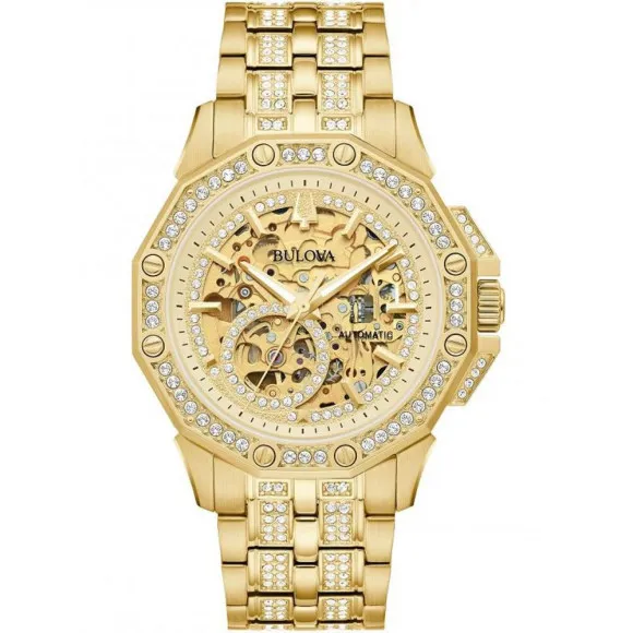 Bulova, a timepiece brand of unfaltering precision and masculine allure, signifies not just a purchase but an investment in legacy. With its artful craftsmanship, Bulova has been engineering watches that encapsulate the essence of luxury and performance since its inception. Striking the perfect chord with the modern gentleman, Bulova encompasses a range of watches tailored to the man who appreciates detail and the fine art of watchmaking. Introducing the Bulova Analogue 'Octava' Men's Watch 98A292, an embodiment of the brand's dedication to excellence. Seated in a lustrous 42mm gold stainless steel case, the Octava radiates sophistication. The round case shape, complemented by a tasteful 12mm thickness, adds a touch of elegance to its robust stature. A stone-settings bezel function surrounds the rich gold dial, enhancing not just the visual appeal but embodying the luxe charisma inherent in Bulova's design language. The heart of the Octava beats with reliable automatic movement, ensuring that your time is always well-kept. Encased beneath a durable mineral glass, the golden dial unfolds a visual story of time with its analogue display. Affixed to the lustrous case is a 21cm matching stainless steel band, with a comfortable 21mm width and a secure deployment clasp, underscoring the watch's devotion to comfort and functionality alongside opulence. Water resistance up to 3 bars and a lug-to-lug height of 50mm complete the Octava's impressive list of attributes, wrapping up a timepiece not just built to accompany you through life's occasions but to enhance them. With Ormoda, luxury extends beyond the realm of products to an entire shopping experience designed to match the grandeur of the items we curate. Ormoda's commitment translates into a spectrum of advantages such as complimentary express shipping delivered by premium couriers. Our confidence in the quality of our assortment is underscored by a 30-day free return policy, which is a promise to our consumers for a worry-free acquisition. Accompanying your timepiece is a robust two-year warranty safeguarding your investment against the unpredictability of time. Additionally, Ormoda has a dedicated team of expert customer support standing by since 1976, ready to assist with your choice and to enrich your shopping journery with knowledge and care.Shop Bulova 98A292 at Ormoda