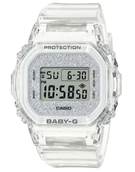 The Casio® Digital 'Baby-g' Women's Watch BGD-565GC-7ER embodies the perfect blend of style and functionality, designed specifically for the modern woman. This exquisite timepiece features a rectangular resin case that is both durable and lightweight, measuring 38mm in length and 30mm in width with a thickness of just 10mm. Crafted with a stunning silver dial, it boasts a mineral glass window that protects its vibrant display. The transparent plastic band, measuring 19cm in length and 21mm in width, is comfortable to wear and effortlessly enhances the watch's contemporary appeal. Equipped with a quartz movement, the watch ensures precise timekeeping complemented by essential features such as an alarm, stopwatch, countdown timer, and light. It also includes a day-date calendar function, making it a perfect companion for daily wear. With a water resistance rating of 10 bars, this watch is here to support you both in your daily activities and during your adventures. Whether you're at work, exercising, or enjoying a night out, the Casio® Digital 'Baby-g' effortlessly combines practicality with chic elegance. This watch is truly an essential accessory for women who value both style and functionality, making it a must-have addition to your collection.