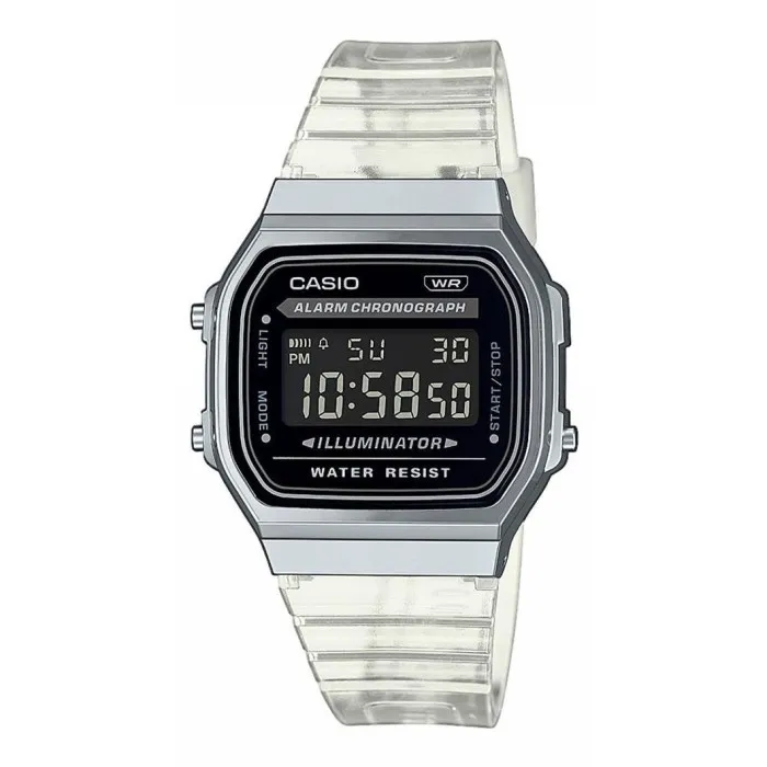 Introducing the Casio® Digital 'Casio Collection' Women's Watch A168XES-1BEF, a seamlessly elegant blend of functionality and style. This watch, designed specifically for the modern woman, exemplifies Casio's commitment to quality and innovation. The brand has been a pioneer in the watchmaking industry, continually delivering timepieces that cater to a variety of lifestyles. With an eye for both practicality and aesthetics, Casio has established itself as a trusted choice for those who seek accessories that reflect their personal style while providing reliable performance. The Casio Collection, renowned for its durability and timeless designs, stands out in the marketplace, showcasing pieces that enhance every outfit—from casual daytime wear to evening elegance. Crafted with precision, the Casio® Digital 'Casio Collection' Women's Watch features a striking black dial that provides a crisp contrast against its square silver resin case. Measuring 36mm in both width and length, and only 9mm in thickness, this watch offers a sleek profile that sits comfortably on the wrist. The transparent plastic band, extending up to 19cm, adds a modern touch while ensuring a secure fit thanks to its reliable buckle clasp. With water resistance up to 3 bars, it is practical for everyday wear and provides a user-friendly day-date calendar feature, making it easy to keep track of your busy schedule. Weighing in at just 25g, this lightweight timepiece ensures that you will wear it with ease, effortlessly transitioning from day to night. Whether you're dressing for work or heading out for a casual outing, the Casio Digital 'Casio Collection' Women's Watch is a versatile addition to any jewelry collection. Its digital display offers clear timekeeping, enhanced by mineral glass for added durability. Balancing sophistication and casual chic, this watch is perfect for women who appreciate both fashion and function, embodying the essence of the Casio brand with every tick. Elevate your accessory game with this charming and practical timepiece.Shop Casio A168XES-1BEF at Ormoda