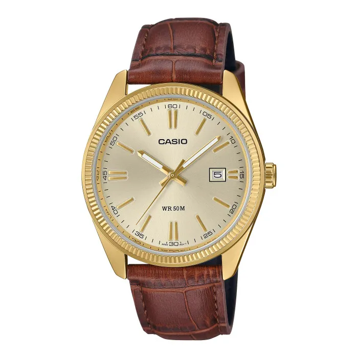 Introducing the Casio® Analogue 'Casio Collection' Men's Watch MTP-1302PGL-9AVEF, a stunning emblem of sophistication and practicality. This exquisite timepiece features a mesmerizing gold-toned case made of durable brass, giving it a classic and luxurious appeal. With a diameter of 38mm and a slim profile of just 9mm in thickness, it comfortably adorns the wrist, adding a touch of elegance to any outfit. The gold dial is adorned with precise hour markers, blending functionality with an eye-catching aesthetic that is sure to impress. Mineral glass covers the dial, offering protection against scratches while ensuring optimal clarity. The watch's leather band in a deep brown hue, with a length of 21cm and a width of 19mm, provides a comfortable yet secure fit. Its time-tested buckle clasp guarantees ease of wear, making it suitable for any occasion, from boardroom meetings to evening outings. With a water resistance rating of up to 5 bars, this timepiece is both practical and versatile, ready to withstand daily challenges without compromising style. Powered by a reliable quartz movement, this timepiece ensures accuracy and minimal maintenance, allowing you to focus on what matters most. The date feature enhances its functionality, keeping you on track with your busy lifestyle. Perfect for the discerning gentleman, the Casio® Analogue 'Casio Collection' is not just a watch; it’s an expression of personal style and sophistication that stands the test of time.Shop Casio MTP-1302PGL-9AVEF at Ormoda