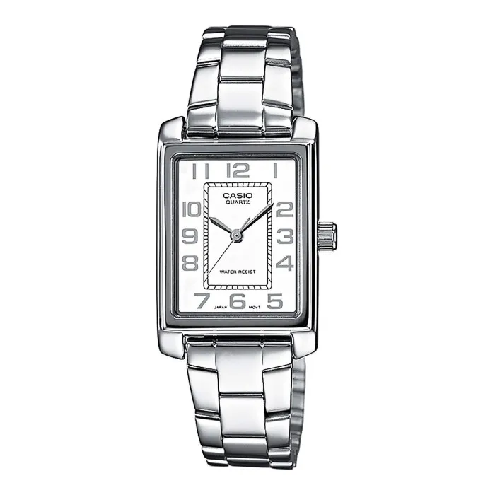 Introducing the Casio® Analogue 'Collection' Women's Watch LTP-1234PD-7BEG. This striking timepiece is a perfect blend of elegance and efficiency, crafted for the modern woman. With its sleek, rectangular brass case coated in lustrous silver, this watch offers a sophisticated aesthetic that seamlessly transitions from day to night. The watch measures 31mm in length, 21mm in width, and has a slender 7mm thickness, giving it a delicate yet sturdy presence on any wrist. The bright white dial contrasts beautifully with the silver-tone hands and markers, ensuring readability at a glance. Protected by robust mineral glass, this watch is designed for everyday wear and tear. Featuring a reliable quartz movement, the timekeeping is exceptionally precise, making sure that you are always on time for your next engagement. The elegant stainless steel band boasts a length of 19cm and is 12mm wide, offering comfort and a snug fit with a fold-over push-button clasp for secure wear. The watch is also rated with a water resistance of 3 bars, making it suitable for light splashes and rain. The Casio® Analogue 'Collection' Women's Watch exemplifies a chic casual style that complements any outfit, from casual to formal. Its lightweight design, weighing only 54 grams, allows for all-day comfort without compromising on style. Adding this exquisite piece to your collection not only enhances your wardrobe but also demonstrates your appreciation for timeless craftsmanship and quality design.Shop Casio LTP-1234PD-7BEG at Ormoda