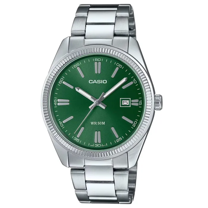 Introducing the Casio® Analogue 'Collection' Men's Watch MTP-1302PD-3AVEF, a perfect blend of style and functionality that resonates with the modern man. Designed for the casual yet sophisticated lifestyle, this watch is crafted with precision. The round brass case features a sleek silver tone that highlights the vibrant green dial, offering a striking contrast that catches the eye. With a case diameter of 38mm and a thickness of just 9mm, it sits comfortably on the wrist, making it an ideal companion for both everyday wear and special occasions. This timepiece operates on a reliable quartz movement, ensuring accurate timekeeping, while the mineral glass window provides a clear view of the dial. The watch also features a date function, seamlessly incorporated into the design, enhancing its practicality. The stainless steel band, measuring 21 cm in length and 18 mm in width, is not only durable but also contributes to the overall aesthetic, giving it a polished look. The MTP-1302PD-3AVEF is built to withstand the rigors of daily life, boasting a water resistance of up to 5 bars, which allows for worry-free wear in various conditions. Whether you are dressing up for a meeting or enjoying a relaxed weekend, this watch exemplifies versatility, making it an essential accessory for the discerning gentleman. With a weight of just 104 grams, it is lightweight yet robust, ensuring comfort and wearability throughout the day.Shop Casio MTP-1302PD-3AVEF at Ormoda