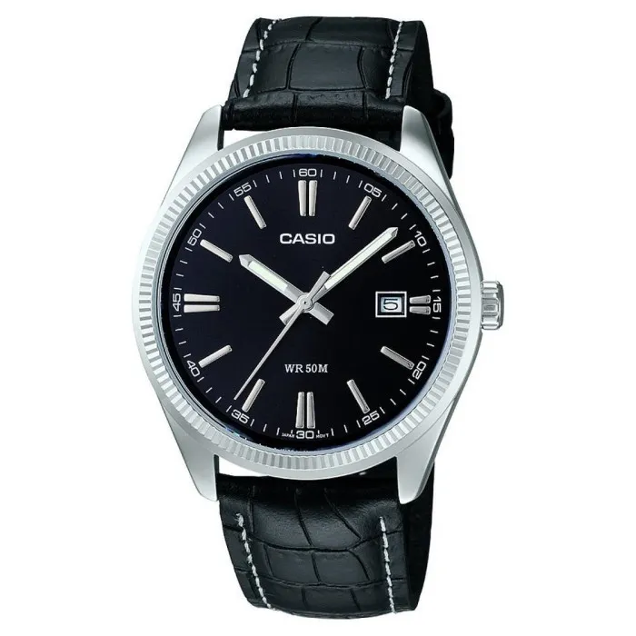Introducing the Casio® Analogue 'Collection' Men's Watch MTP-1302PL-1AVEF, a perfect fusion of sophistication and functionality designed for the modern man. This watch is not just a timepiece; it's a statement of style. Crafted with a silver brass case that measures a assertive 39mm in diameter, it exudes a sense of durability and elegance. The round case design offers a classic look that will seamlessly transition from casual outings to more formal occasions. The watch thickness of 9mm sits comfortably on the wrist, ensuring both comfort and style. What makes this model truly stand out is its striking black dial, which is protected by robust mineral glass. This combination creates a striking contrast, enhancing visibility and adding to the watch’s refined aesthetic. The watch displays analogue time with an easy-to-read date calendar, making it highly practical for daily wear. Fashioned with a black leather band measuring 21cm in length and 19mm in width, it provides a comfortable fit, secured with a reliable buckle clasp. The Casio Men's Watch is powered by a precise quartz movement, ensuring you are never late for any appointment. With a water resistance of 5 bars, you can wear it confidently whether you're at the office or enjoying a casual day out. Renowned for its versatility, this watch is a significant addition to any man's collection, making it an ideal gift for yourself or a loved one.Shop Casio MTP-1302PL-1AVEF at Ormoda
