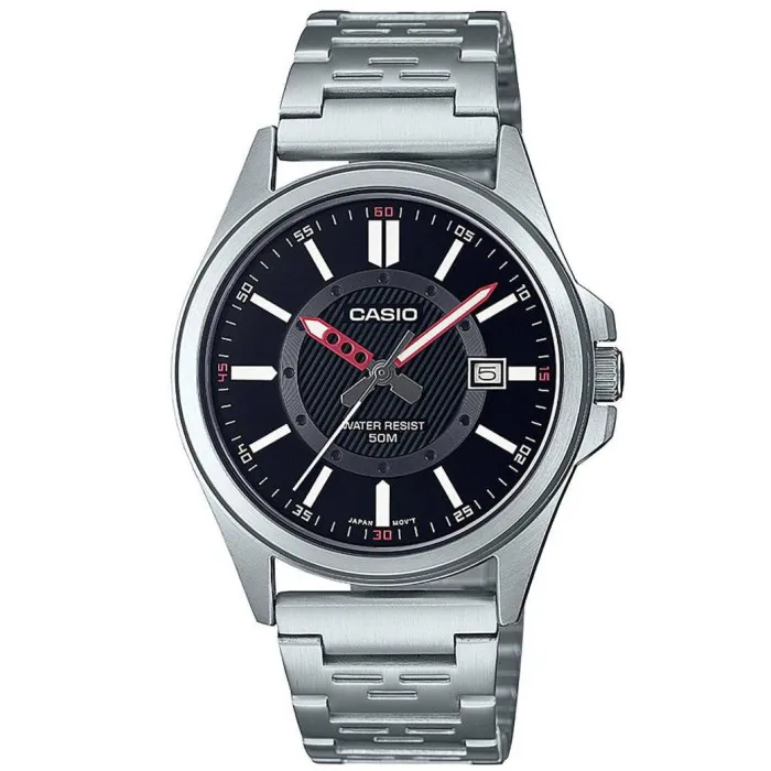 Introducing the Casio® Analogue 'Collection' Men's Watch MTP-E700D-1EVEF, where durability meets sophistication. This striking timepiece embodies the perfect blend of style and practicality, designed explicitly for the modern man who values both form and function. With a sleek silver stainless steel case and band, this watch exudes a professional yet approachable aesthetic, suitable for various occasions, from casual outings to the office environment. The round case design, measuring 38mm in diameter, and a slim profile of just 10mm thick ensure a comfortable fit on the wrist, while its 5 bars water resistance offers practicality for everyday wear. The bold black dial serves as a dramatic contrast against the silver elements, enhancing its visual appeal while ensuring easy readability. Protected by durable mineral glass, the watch's face remains resistant to scratches, promising longevity. The analogue display features a convenient date function, perfectly catering to the busy lifestyle of the wearer. The fold-over clasp with push-button ensures a secure fit while allowing for easy adjustments, accommodating wrists sized up to 21cm in length. As part of Casio's esteemed collection, this watch is driven by a reliable quartz movement, guaranteeing accurate timekeeping. The combination of classic design with modern reliability makes the Casio® Analogue 'Collection' Men's Watch not just a timepiece but a reflection of your personal style and professional ethos. With attention to detail and quality craftsmanship, this watch stands as a testament to Casio's legacy in the watchmaking industry, making it an essential addition to any man's accessory lineup.Shop Casio MTP-E700D-1EVEF at Ormoda