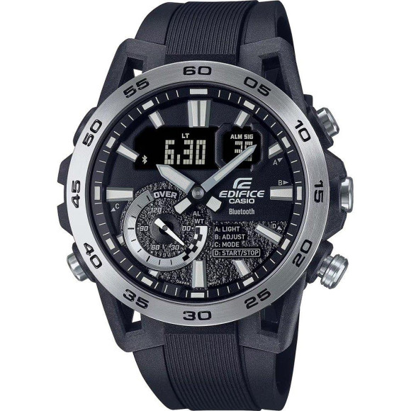 Introducing the Casio® Analogue-digital 'Edifice' Men's Watch ECB-40P-1AEF, a masterful blend of style and functionality designed for the modern man. This watch is not just a timepiece; it’s a statement. With a stunning black resin case, this watch boasts a diameter of 43mm and a thickness of 13mm, providing a robust presence on the wrist. The round case design is complemented by a uniquely designed bezel featuring numbers, ensuring practical usability. The sleek black dial is shielded by durable mineral glass, ensuring that your watch remains pristine even in the toughest environments. The watch features a sport style that makes it versatile enough for both daily wear and special occasions. With quartz movement, you can rest assured that the time it displays is precise and reliable. This model is packed with features that cater to the active lifestyle, including Bluetooth connectivity, a stopwatch, world time display, alarm function, and an easy-to-read light, making it suitable for all types of adventures. The day-date calendar function adds even more practical functionality to your daily life. The black plastic band, measuring 23mm in width and weighing just 62 grams, ensures a comfortable fit while maintaining an elegant look. Designed to withstand the rigors of an active life, this timepiece is water resistant up to 10 bars. Whether you are hitting the gym, heading to the office, or exploring new horizons, the Casio® Analogue-digital 'Edifice' Men's Watch ECB-40P-1AEF will keep you on track and looking stylish. Its 21cm long strap and durable materials make it a reliable companion, wherever your day may lead you.Shop Casio ECB-40P-1AEF at Ormoda