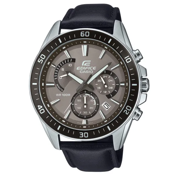 Introducing the Casio® Chronograph 'Edifice' Men's Watch EFR-552L-5AVUEF, a pinnacle of stylish functionality tailored for the modern man. This watch embodies the perfect blend of sportiness and sophistication. With a striking round case made from durable stainless steel, it showcases a commanding 45mm diameter that fits comfortably on the wrist. The grey dial features luminous hands and numbers, ensuring readability even in low-light conditions. Additionally, the bezel adorned with numbers enhances its sporty charm, making it suitable for both casual and formal occasions. Powered by a precise quartz movement, this watch guarantees accuracy and reliability, keeping you punctual at all times. The chronograph display allows you to measure time with precision, featuring a stopwatch and a 24-hour display function that is perfect for timing events, workouts, or simply tracking your day. The watch is water-resistant up to 10 bars, making it a reliable companion for those who enjoy aquatic activities. Complementing the stunning case is a sleek black leather band that exudes professionalism while ensuring a comfortable fit. The buckle clasp provides a secure fastening, giving you confidence throughout your busy day. With a band length of 21cm and a width of 21mm, it suits a wide range of wrist sizes. The Casio® Chronograph 'Edifice' is not just a timepiece; it's a statement of style, efficiency, and adventure, making it an ideal addition to any man's collection. Shop Casio EFR-552L-5AVUEF at Ormoda