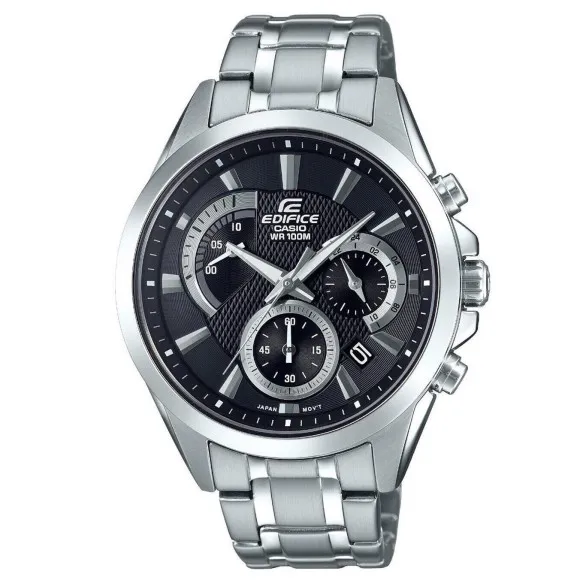 The Casio® Chronograph 'Edifice' Men's Watch EFV-580D-1AVUEF is a spectacular representation of the Edifice line, blending precision, style, and functionality tailored for the modern man. Designed with a sporty flair, this watch features a robust and dynamic quartz movement, ensuring reliability and accurate timekeeping whether you're at the office, on the track, or out for the evening. The elegantly round stainless steel case, with a sturdy thickness of 12 mm and a diameter of 42 mm, embodies a confident presence on the wrist while maintaining a reasonable weight of 140 g for comfort throughout the day. An eye-catching black dial contrasts beautifully against the silver case, enriching visibility and sophistication. The mineral glass window provides a durable shield against scratches, preserving the watch's aesthetic appeal. The chronograph display adds a sporty edge, allowing you to time events with impeccable accuracy. A convenient date calendar enhances practicality, perfect for maintaining your schedule effortlessly. Water-resistant up to 10 bars, this watch is built to withstand daily demands and adventures alike. Complementing the case is a silver stainless steel band that exudes a sense of elegance while being durable enough for everyday wear. With an adjustable length of 21 cm and a width of 18 mm, the band is suitable for various wrist sizes, equipped with a fold-over push-button clasp for secure and easy fastening. The Casio Edifice is more than just a watch; it’s a statement piece, effortlessly elevating your wardrobe while ensuring you stay punctual and stylish. Shop Casio EFV-580D-1AVUEF at Ormoda