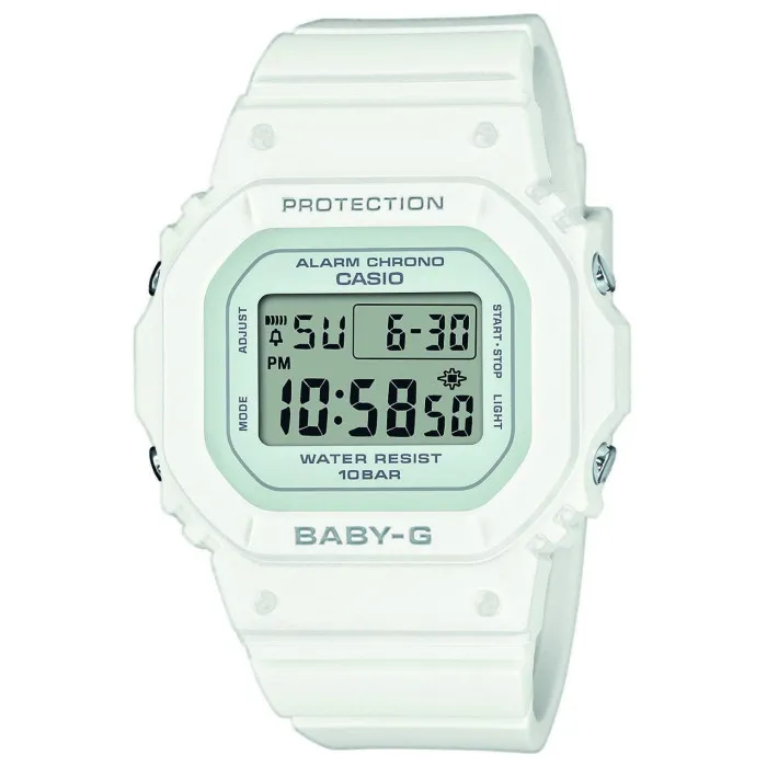 The Casio® Digital 'G-shock' Women's Watch BGD-565-7ER is a stunning blend of style and durability, designed with the modern woman in mind. This sporty watch is not just about looks; it is engineered for functionality and reliability. With a quartz movement, you can count on its precision in keeping time. The watch features a striking white resin case, measuring 37mm in length and 30mm in width, with a sleek rectangular style that is both feminine and sporty. Its 10mm thickness gives it a robust presence on the wrist while still being comfortable for everyday wear. The LCD dial is protected by a mineral glass window, ensuring clarity and ease of reading at a glance. The watch's digital display includes a comprehensive day-date calendar feature, which is practical for everyday use. The Casio G-shock is crafted to withstand the elements, with a water resistance rating of 10 bars, making it suitable for various activities, from swimming to light diving. The white plastic band, measuring 19cm in length and 21mm in width, complements the case while providing a snug fit. It is equipped with a traditional buckle clasp for secure wear. Additional features such as a stopwatch, countdown timer, alarm, and light make this watch an ideal companion for both fitness enthusiasts and those requiring practicality in their daily lives. Weighing just 30 grams, it offers a lightweight feel without compromising on style. The Casio G-shock encapsulates empowering functionality and elegance, perfectly catering to the dynamic lifestyles of women today.Shop Casio BGD-565-7ER at Ormoda
