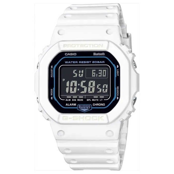 The Casio® Digital 'G-shock' Men's Watch DW-B5600SF-7ER embodies strength and functionality, aiming to be the perfect companion for the modern man. With a sport-driven design, this watch features a robust white resin case that is built to withstand any challenge, measuring 43mm in length and 34mm in width. Its rectangular shape not only looks sharp but also adds a unique twist to your timepiece collection. The black dial catches the eye, protected by a durable mineral glass window that ensures clarity and resilience under various conditions. Equipped with a quartz movement, this watch guarantees precision, while a host of extra features caters to your active lifestyle. Enjoy the convenience of Bluetooth connectivity, utilize the stopwatch and countdown capabilities for workouts, and keep track of global time zones with the worldtime function. The alarm feature ensures you stay punctual, no matter the occasion. Comfort is not overlooked, as the watch comes with a 21cm long white plastic band that wraps around securely with a traditional buckle clasp, providing ease of wear throughout the day. Designed for those who adore adventure, this timepiece boasts a remarkable 20-bar water resistance, making it suitable for various activities, from swimming to water sports. Weighing just 52 grams, the Casio G-shock ensures that it fits neatly on your wrist without feeling cumbersome. Whether you're hitting the gym or heading out for a weekend adventure, this digital watch is the ultimate accessory that marries style with practicality.Shop Casio DW-B5600SF-7ER at Ormoda