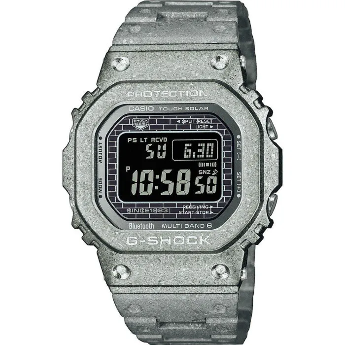 The Casio® Digital 'G-shock G-metal 40th Anniversary' Men's Watch GMW-B5000PS-1ER is a stunning tribute to four decades of innovation in the world of timekeeping. This timepiece embodies a perfect blend of sporty functionality and modern elegance. With its rectangular stainless steel case, measuring 43mm in length and 35mm in width, it projects a powerful presence on the wrist, while the thickness of 13mm ensures comfort without compromising on style. The watch's sleek silver case is beautifully contrasted by a striking black dial, protected by durable mineral glass, which features a digital display for sharp visibility under any lighting conditions. The G-shock lineup is renowned for its resilience, and this model takes that to new heights with an impressive water resistance rating of 20 bars, making it suitable for underwater adventures. The stainless steel band, with a length of 21cm and a width of 24mm, is not just a style statement but also features a fold-over clasp with a push button to ensure a secure fit. Packed with advanced features, including solar power, Bluetooth connectivity, radio control, stopwatch functionality, and a built-in light, this timepiece is designed for the modern man who appreciates both form and function. This watch is not just about looks; it is engineered for performance. The day-date calendar keeps you organized, while the Bluetooth technology allows for seamless synchronization with your devices. Whether you’re at work, on a weekend adventure, or just enjoying time with friends, the Casio G-shock G-metal 40th Anniversary is a versatile companion that doesn't compromise on luxury or durability. This watch is more than an accessory; it’s a statement of style and a celebration of craftsmanship. Shop Casio GMW-B5000PS-1ER at Ormoda