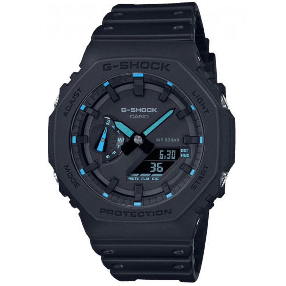 The Casio Analogue-digital 'G-shock' Men's Watch GA-2100-1A2ER is a remarkable fusion of toughness, functionality, and style tailored for the modern man. Combining both analog and digital displays, this versatile timepiece is designed to keep up with your active lifestyle while making a bold statement. The rugged black resin case, with a diameter of 45mm and a thickness of just 11mm, exudes durability, embodying the essence of the G-Shock brand's commitment to providing robust watches that can withstand extreme conditions. The watch is equipped with a mineral glass dial window that not only enhances visibility but also protects against scratches and impacts. The striking black dial, complemented by the intuitive analogue-digital display, offers a seamless experience to read the time at a glance while incorporating advanced features such as a stopwatch, world time, countdown timer, alarm, and a light function for low-light situations. The watch is resistant to water pressure up to 20 bars, making it suitable for all types of water activities. For optimal comfort, the watch features a plastic band with a length of 21cm and a width of 24mm, secured by a reliable buckle clasp. With a weigh-in of only 52 grams, it guarantees a lightweight feel without compromising on sturdiness. Whether you're at work, in the gym, or exploring the great outdoors, the Casio GA-2100-1A2ER is an essential accessory that combines practicality with a bold aesthetic, ensuring that you always stay ahead of time.Shop Casio GA-2100-1A2ER at Ormoda