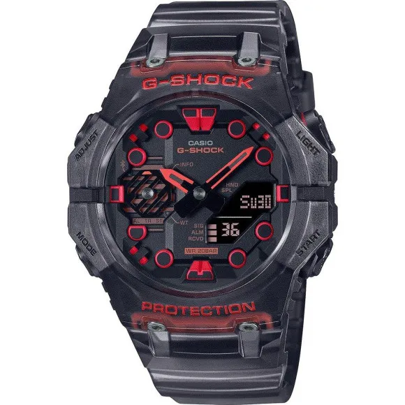 Casio® Analogue-digital 'G-shock' Men's Watch GA-B001G-1AER expertly blends practicality with cutting-edge technology, designed specifically for the modern man who appreciates both style and performance. This striking timepiece is engineered by Casio, a brand renowned for its innovative designs and unyielding reliability. The G-Shock series, a hallmark of toughness, elevates your wrist game with its rugged aesthetic and advanced features. With a robust black resin case measuring 44mm in diameter, this watch is perfectly sized to stand out without feeling bulky. Its bold red dial adds a captivating contrast, ensuring easy readability even in challenging conditions. This watch is not just about looks; it embodies functionality with a quartz movement that ensures precision timing. The analogue-digital display caters to diverse preferences, while Bluetooth connectivity allows for seamless synchronization with your smartphone. You will appreciate the additional features such as a stopwatch, countdown timer, world time, and an alarm, making it an ideal companion whether you're at work or on an adventure. Water-resistant up to 20 bars, this watch is designed to withstand the elements, making it the perfect choice for the active man. The comfortable black plastic band boasts an adjustable length of 21cm and a sturdy width of 23mm, secured with a reliable buckle. With a thickness of just 13mm, it sits snugly on the wrist, bringing together comfort and durability. Whether you’re hiking, swimming, or engaging in your daily routine, the Casio® Analogue-digital 'G-shock' Men's Watch GA-B001G-1AER combines form and function, ensuring you are always ready for what life throws your way. Shop Casio GA-B001G-1AER at Ormoda