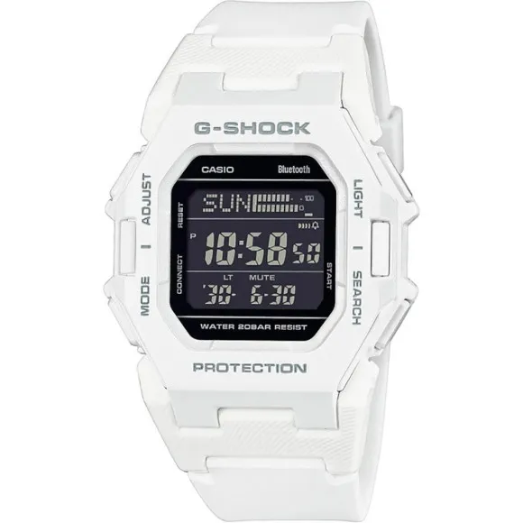 Introducing the Casio® Digital 'G-shock' Men's Watch GD-B500-7ER, a perfect blend of reliability and modern style designed for the dynamic man. This timepiece showcases Casio's longstanding legacy of precision and durability, embodying the spirit of adventure that every wearer seeks. Renowned for their robust and sturdy designs, G-shock watches have a reputation for suffering through whatever life throws at them while consistently delivering accurate timekeeping. You can trust this watch to be your loyal companion, whether you are conquering new heights in the outdoors or navigating your daily routine in the city. This model features a striking white resin case that exudes a contemporary vibe with its square shape and thick design, measuring a compact 41mm in length and width. A beige dial provides a stark and easy-to-read display, further protected by durable mineral glass, safeguarding its functionality against the rigors of everyday life. The watch is equipped with an array of features including Bluetooth connectivity, a stopwatch, dual time, and a countdown timer, offering endless versatility for an active lifestyle. The watch band, made from sturdy plastic, matches the case color and boasts a length of 21cm and width of 22mm, ensuring a comfortable fit around any wrist. The secure buckle clasp keeps the watch firmly in place while maintaining an effortlessly stylish look. With a remarkable water resistance of 20 bars, this G-shock watch is not just a pretty face; it’s designed to withstand an aquatic adventure too. Optimal functionality is guaranteed, along with an appealing aesthetic that suits both casual and formal occasions, making it an essential accessory for any man's collection.