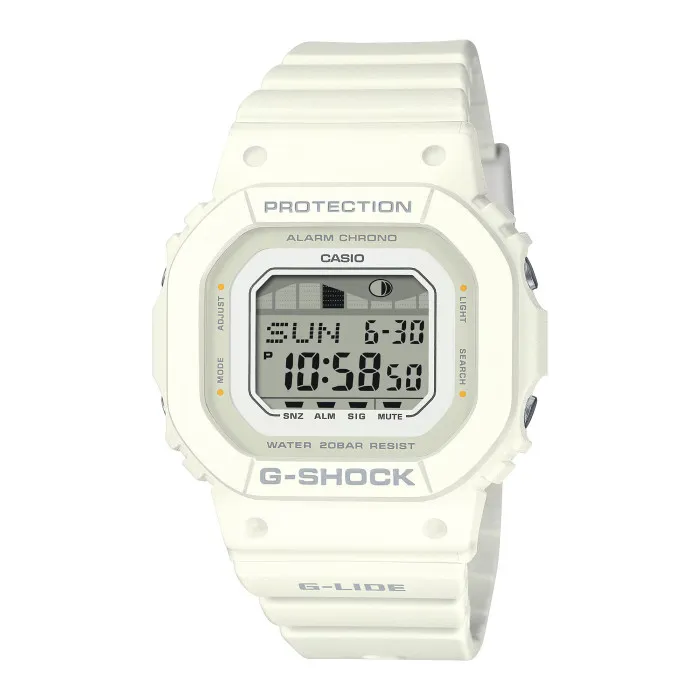 Introducing the Casio® Digital 'G-shock' Women's Watch GLX-S5600-7BER, a remarkable fusion of style and functionality designed specifically for the active woman. This watch embodies the essence of contemporary design, adorned with a sleek white resin case that beautifully complements its digital LCD dial. With a rectangular case measuring 40mm in length and 32mm in width, this timepiece is both sturdy and elegant. The 11mm thickness offers a slim profile, making it a comfortable fit for everyday wear. Resilience is key with Casio, and this watch is built to last, with an impressive water resistance of up to 20 bars, effortlessly accommodating all water-related activities. The white plastic band, extending to 19cm in length and 24mm in width, secured with a reliable buckle clasp, intertwines comfort with a chic aesthetic. This watch is more than just an accessory; it is equipped with an array of features designed for modern lifestyles, including a stopwatch, countdown timer, tide tracker, world time function, and alarm. Every feature is thoughtfully crafted to enhance convenience and versatility, empowering women to embrace their dynamic lives with confidence. This timepiece is the perfect blend of fashion and function, ensuring that you stay on time and in style, wherever your adventures lead you.Shop Casio GLX-S5600-7BER at Ormoda