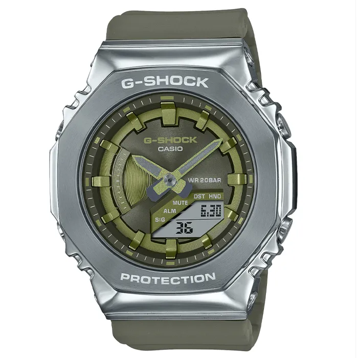 Introducing the Casio® Analogue-digital 'G-shock' Women's Watch GM-S2100-3AER, a vibrant expression of style and functionality. This watch is designed for the modern woman who embraces both elegance and adventure. With its stunning green dial set against a stainless steel case, it effortlessly combines chic aesthetics with rugged durability. The distinctive analogue-digital display enhances its versatility, making it suitable for both casual outings and more formal occasions. Measuring 36mm in diameter, the round case sits comfortably on the wrist, giving it a graceful yet sturdy presence. The mineral glass window protects the dial, ensuring clarity and resilience in daily wear. The plastic band complements the green of the dial and is designed for comfort, measuring 19cm in length and 19mm in width. The watch also features a practical buckle clasp, making it easy to wear throughout the day. Functionality is paramount with the inclusion of features such as a stopwatch, countdown timer, world time, alarm, and a light – perfect for those on the go. With a water resistance of up to 20 bars, you can confidently wear it in various environments, from the office to the beach. This exquisite timepiece embodies the spirit of G-Shock, known for its innovative designs and exceptional performance, ensuring that you not only look good but also stay connected and prepared for all life’s adventures.Shop Casio GM-S2100-3AER at Ormoda