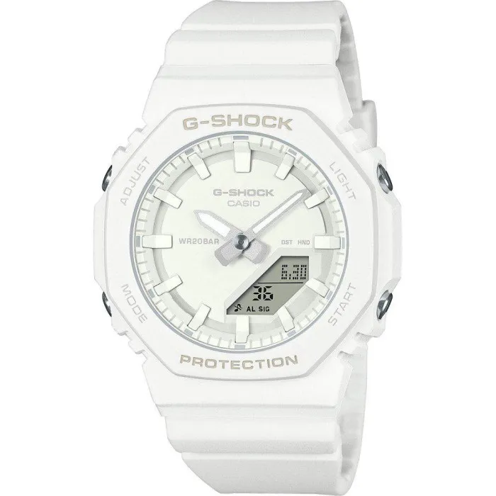Introducing the Casio® Analogue-digital 'G-shock' Women's Watch GMA-P2100-7AER, a perfect blend of style and functionality made for women who lead active lifestyles. Casio continues its legacy of innovation with this timepiece, designed to withstand the elements and keep up with your adventures. Renowned for its durability, the G-shock collection boasts an impressive reputation since its inception, often regarded as the go-to selection for sporty women who appreciate resilience in their accessories. This particular model encapsulates the spirit of modern fashion with its chic white color, making it versatile enough for both casual outings and more formal gatherings. This enticing watch features a reliable quartz movement, ensuring accurate timekeeping for all your daily tasks. The round resin case, measuring 40mm in diameter, houses a white dial adorned with both analogue and digital displays. This unique combination is not only stylish but also practical, providing you with essential information at a glance. The watch is equipped with features such as a stopwatch, countdown timer, world time, and alarm, catering to the needs of the multitasking woman. With a water resistance of up to 20 bars, this timepiece is perfect for swimming and other water-related activities, freeing you from the worries of damage. Complemented by a 19cm plastic band, it secures comfortably on your wrist with a buckle clasp that ensures easy wear and removal. The watch's contemporary design makes it adaptable, suiting various outfits, from sporty to casual chic. Weighing only 40 grams, it promises comfort without compromising on style or performance. Choose the Casio® Analogue-digital 'G-shock' Women's Watch GMA-P2100-7AER for a reliable companion that matches your dynamic lifestyle effortlessly.Shop Casio GMA-P2100-7AER at Ormoda