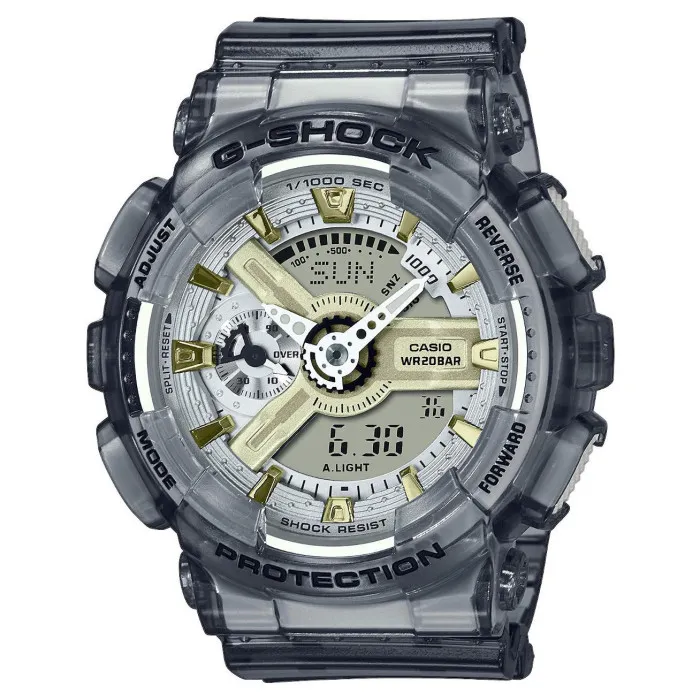 Casio® Analogue-digital 'G-shock' Men's Watch GMA-S110GS-8AER combines robustness with a distinctive style, tailored specifically for discerning men who appreciate both functionality and aesthetics. This striking timepiece brings the best of both worlds, featuring a military-style design that exudes strength and authority. Crafted with a transparent resin case that measures 45mm in diameter and a thickness of 13mm, this watch showcases durability while remaining incredibly stylish. The vibrant multicolour dial, protected by mineral glass, displays the time with precision and clarity, suitable for any setting—be it an outdoor adventure or a formal occasion. This watch is equipped with a reliable quartz movement to ensure accurate timekeeping, guaranteeing you will never miss a beat. The analogue-digital display offers versatility, allowing you to seamlessly switch between traditional analogue and modern digital readings. With a 20-bar water resistance rating, it's perfect for adventurous spirits who enjoy water sports or simply want peace of mind while out and about. Additionally, the Casio G-Shock features multiple functionalities to enhance your experience. From a stopwatch to world time, countdown, alarm, and an illuminating light, it is a trusty companion throughout your day. The 21cm long transparent plastic band is not only comfortable but also adds to the striking overall aesthetics, while the secure buckle clasp ensures a perfect fit. With an impressive lug to lug height of 48mm and a width of 24mm, this watch fits every wrist size with ease, making it an ideal choice for any man seeking a blend of durability and modern style.Shop Casio GMA-S110GS-8AER at Ormoda
