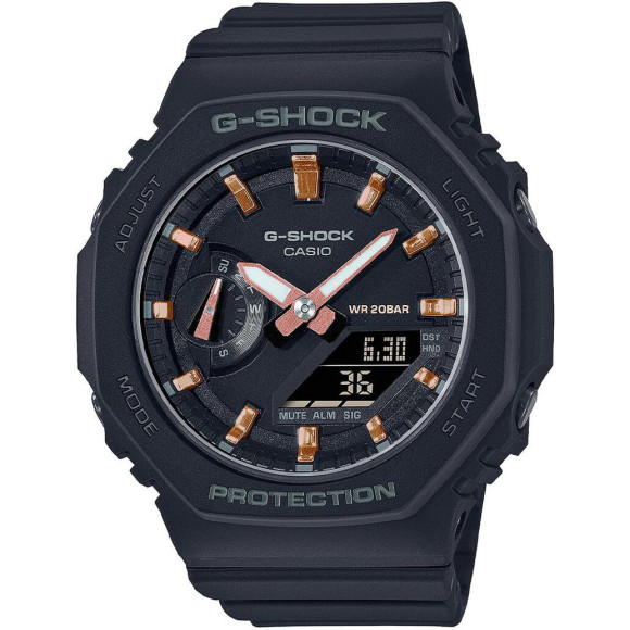 The Casio® Analogue-digital 'G-shock' Men's Watch GMA-S2100-1AER brings together innovation and style, attracting the discerning modern man who values both functionality and aesthetics. With a 40mm round resin case, this timepiece is engineered to withstand the rigors of an active lifestyle while also maintaining a sleek, contemporary look. The striking black case and dial, coupled with a durable black plastic band, creates a bold statement that is perfect for both casual outings and sporty adventures. Equipped with quartz movement, this watch ensures precision timing, ideal for those who lead busy lives and expect reliability in their accessories. The G-shock series is known for its durability, and this model is no exception. Featuring an impressive water resistance of up to 20 bars, it is suitable for swimming and snorkeling, making it a perfect companion for water sports enthusiasts. The analogue-digital display offers versatility, displaying both classic timekeeping and digital features. It includes practical functions such as a stopwatch, world time, countdown timer, alarm, and light, enhancing its functionality. The watch also incorporates a day-date calendar, providing essential information at a glance. With a thickness of just 11mm, it offers comfort for daily wear without compromising on durability. With a weight of 42 grams, this watch sits lightly on the wrist, ensuring ease of movement throughout any activity. The buckle clasp secures the watch comfortably, allowing for easy adjustments to achieve the perfect fit. The GMA-S2100-1AER is not just a watch; it is an everyday companion designed for men who value performance, style, and resilience.Shop Casio GMA-S2100-1AER at Ormoda