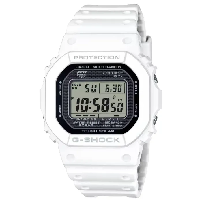 The Casio® Digital 'G-shock' Men's Watch GW-5000HS-7ER is the epitome of rugged sophistication and reliable performance. Designed for men who lead an active lifestyle, this remarkable timepiece combines robust features with elegant aesthetics. The rectangular resin watch case, measuring 43mm in length and 35mm in width, showcases a crisp black dial that contrasts beautifully with its white casing. Not only is the timepiece visually striking, but it also harbors impressive functionality. With a thickness of just 13mm, it comfortably fits on the wrist while maintaining a commanding presence. The mineral glass window ensures durability, while the watch’s digital display features a day-date calendar, a stopwatch, alarm functionalities, and world time, making it perfect for the globe-trekking gentleman. This sturdy watch is solar-powered, allowing for continuous operation without frequent battery changes. The 20 bars of water resistance ensure that it can withstand any adventure, whether you're diving into the deep blue or navigating through stormy weather. The white plastic band, with a length of 21cm and a width of 24mm, provides a secure fit thanks to its reliable buckle clasp. Weighing only 72 grams, the watch feels light on the wrist while exuding a sense of durability. The overall design embraces both style and functionality, making it a perfect choice for any occasion, from casual outings to formal events. The Casio® 'G-shock' is more than just a watch; it’s a lifestyle statement.Shop Casio GW-5000HS-7ER at Ormoda