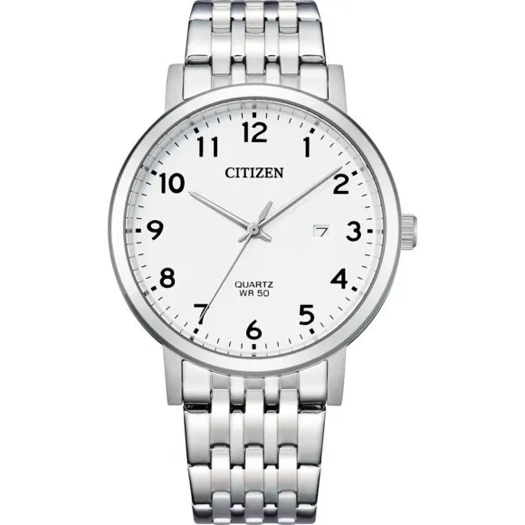 The Citizen® Analogue Men's Watch BI5070-57A is a masterpiece of precision and style, designed to blend seamlessly into the modern man’s lifestyle. Crafted with an elegant simplicity, this watch features a striking white dial that is both easy to read and timeless in its appeal. The 40mm round case is made from durable stainless steel, ensuring both longevity and a sleek finish that enhances its aesthetics. The 8mm thickness keeps it sleek against the wrist. It’s the kind of watch that can easily transition from a casual outing to a more formal affair, making it a versatile addition to any wardrobe. The watch's quartz movement ensures impeccable timekeeping, a feature that every ambitious man appreciates. With a date calendar function, it offers more than just time; it aids in daily planning. The mineral glass dial window adds a layer of protection while maintaining a crystal-clear view of the time. The silver-colored band, also made from stainless steel, measures 19mm in width and 21cm in length, providing a perfect fit for most wrist sizes. Its fold-over clasp with push button ensures a secure yet easy-to-use fastening, allowing for comfortable wear throughout the day. With a water resistance of up to 5 bars, the Citizen® Analogue Men's Watch BI5070-57A stands up to the rigors of everyday life, whether you’re at the office or enjoying a day out in the sun. The understated design makes it suitable for any occasion, while its robust construction ensures it will remain a reliable companion for years to come. It’s not just a watch; it’s a reflection of your commitment to quality and sophistication.