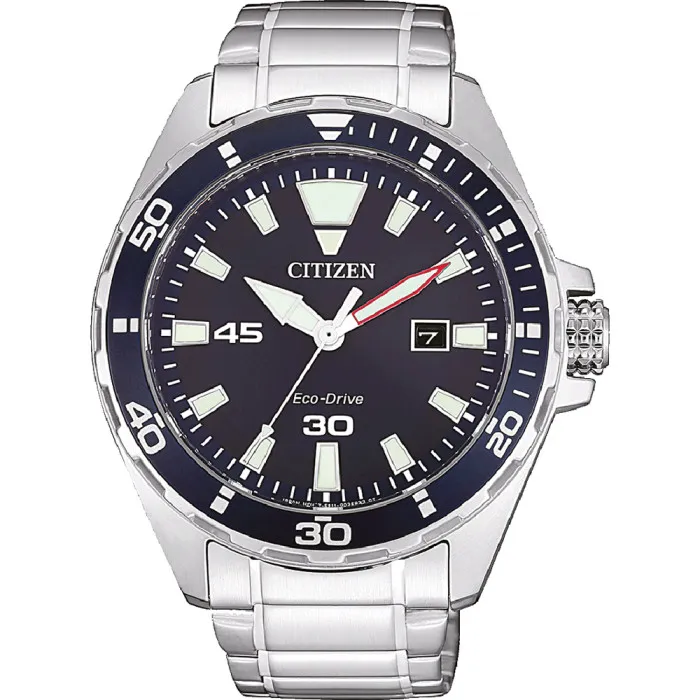 Introducing the Citizen® Analogue Men's Watch BM7450-81L, a striking representation of sophistication in timekeeping. Engineered for the modern man, this watch seamlessly combines durability and style. The heart of the timepiece lies in its Eco-Drive movement, which harnesses light to power the watch, ensuring you never have to worry about changing batteries. The watch features a robust round stainless steel case, measuring 43mm in diameter and 12mm in thickness. The stunning blue dial creates an eye-catching contrast against the silver case and bezel. Encased in mineral glass, the dial boasts clarity and strength, providing protection against the rigors of daily wear. The turnable bezel adds a functional aspect, ideal for timing various activities, whether in a professional setting or during recreational pursuits. A standout feature of this timepiece is its stainless steel bracelet. It offers a comfortable fit at 21 cm in length and 20 mm in width, secured with a reliable fold-over clasp with a push-button mechanism. This ensures that the watch remains securely on your wrist. With a water resistance of up to 10 bars, the Citizen® watch is suitable for everyday wear, as well as more strenuous aquatic adventures. The watch also incorporates a date function, providing a perfect blend of practicality and luxury. The Citizen® Analogue Men's Watch BM7450-81L epitomizes the spirit of adventure and the refinement that modern men seek in a quality timepiece.Shop Citizen BM7450-81L at Ormoda