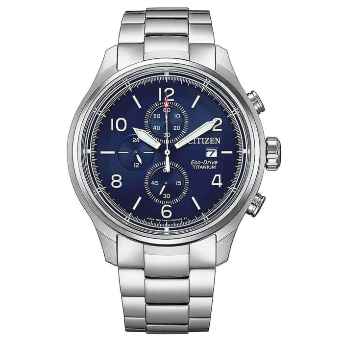 Introducing the Citizen® Chronograph Men's Watch CA0810-88L, where elegance meets impeccable functionality. This watch is designed for the modern man who appreciates both style and performance. The sophisticated blue dial is adorned with luminous hands and a practical date display, ensuring you stay on time and in style. Crafted from durable titanium, the round case has a sleek silver finish that complements a variety of outfits, from casual to business attire. Measuring 44mm in diameter and 11mm in thickness, the case combines a substantial presence without compromising comfort on the wrist. With a sapphire glass window, this watch offers superior scratch resistance while showcasing the intricate details of its chronograph display. The solar-powered Eco-Drive movement means you enjoy the luxury of not having to worry about battery changes. The sturdy titanium band, measuring 21cm in length and 21mm in width, ensures a secure fit with its dependable fold-over clasp featuring a push button. With an impressive water resistance of up to 10 bars, this watch is as robust as it is refined, perfect for active lifestyles. Whether you are in a boardroom meeting or enjoying a casual weekend, the Citizen® Chronograph Men's Watch is the epitome of luxury and versatility. Elevate your wrist game with this masterful timepiece.Shop Citizen CA0810-88L at Ormoda