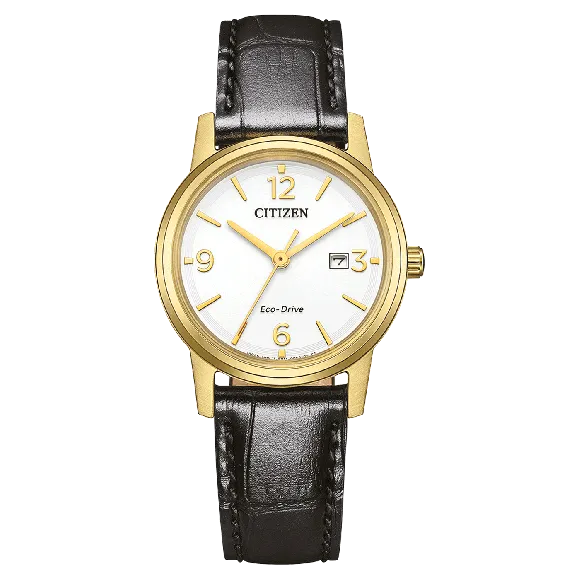 Introducing the Citizen® Analogue Women's Watch, an exquisite piece that perfectly embodies sophistication with its elegant design. Crafted with a gleaming gold stainless steel case measuring 30mm in diameter, this watch exudes a sense of luxury. Its round style, with a delightful case thickness of just 7mm, offers a delicate silhouette that complements any wrist size effortlessly. The clean white dial, protected by durable crystal glass, features a date calendar for added functionality, seamlessly blending practicality with elegance. With the Eco-Drive movement, you can say goodbye to battery changes, as this innovative technology is powered by light, ensuring you can enjoy your timepiece without interruptions. The watch is adorned with a striking black leather band that measures 19cm in length and 15mm in width, providing comfort while maintaining a chic appearance. The buckle clasp ensures a secure fit, making it suitable for both daily wear and special occasions. This timepiece not only makes a statement but also offers a 3-bar water resistance, ensuring it withstands splashes and light rain with ease. Weighing only 27 grams, this watch is as light as it is beautiful, making it a perfect addition to any jewelry collection. Let the Citizen® Analogue Women's Watch be your companion, enhancing your style while keeping you punctual and poised. Shop Citizen EW2722-01A at Ormoda