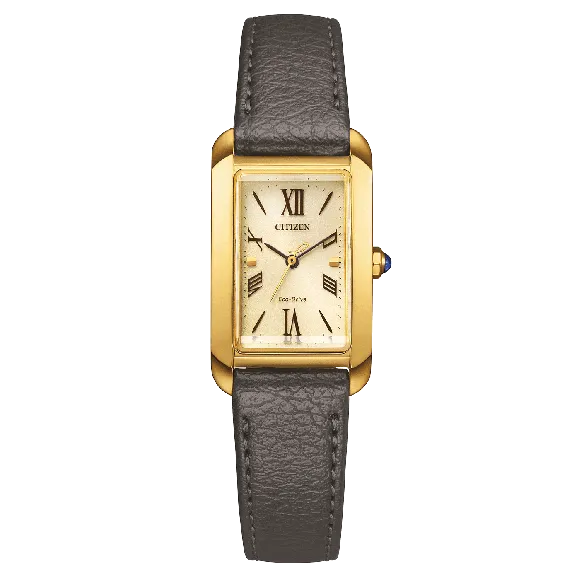The Citizen® Analogue 'L' Women's Watch EW5622-09P is a stunning piece that encapsulates both elegance and functionality. With its eco-drive technology, this watch is powered by light, ensuring that you never have to worry about battery changes. The rectangular case, measuring 25mm in length and 19mm in width, is crafted from high-quality stainless steel, radiating a luxurious gold hue that is perfect for any occasion. Its slender profile, with a thickness of only 7mm, offers a poised and refined silhouette on the wrist. The champagne-colored dial adds a touch of sophistication, beautifully complemented by the sapphire glass that protects it, ensuring durability and clarity. The grey leather band, measuring 19cm in length and 14mm in width, provides an exceptional comfort fit while exuding a stylish charm. The deployment clasp ensures security, allowing for effortless wear. With a water resistance of 5 bars, this watch is both practical and chic, ready to accompany you through various activities with grace. Suitable for the modern woman who appreciates quality and aesthetics, this timepiece is not just a watch but a statement of personal style, embodying the ethos of Citizen's renowned craftsmanship and innovation.