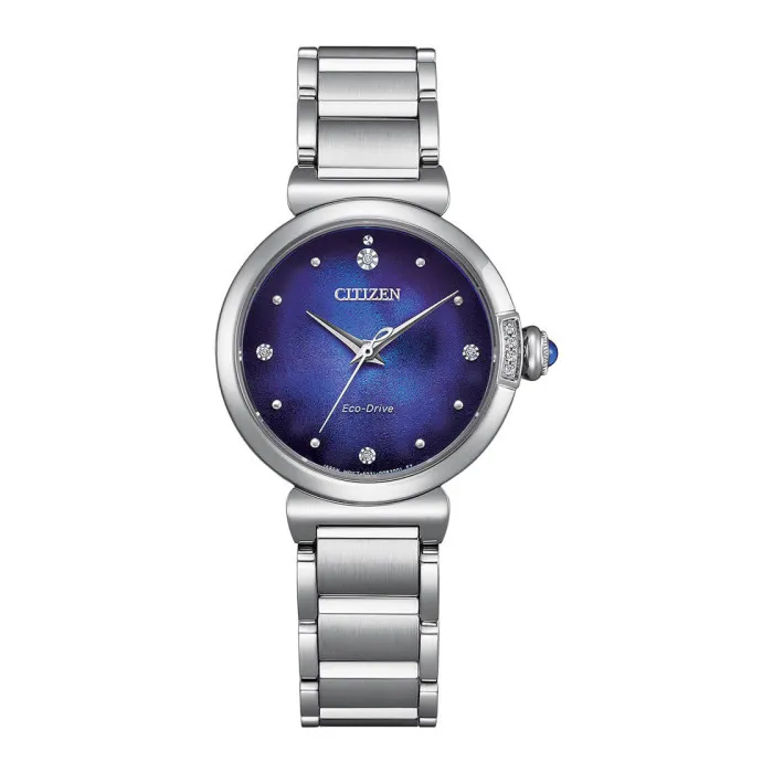 Embrace elegance with the Citizen® Analogue 'L May Bells' Women's Watch EM1060-87L, a stunning timepiece designed for the modern woman. At the heart of this exquisite watch is the innovative Eco-Drive movement, ensuring that you stay on trend without the hassle of battery replacements. The classic round case, meticulously crafted from premium stainless steel, radiates sophistication with its gleaming silver finish. Measuring 29mm in diameter and only 8mm in thickness, it sits gracefully on the wrist, making a statement without overwhelming your personal style. The rich blue dial is a delightful contrast to the lustrous silver case, adorned with sparkling diamonds that add a touch of luxury to this sleek accessory. The watch is protected by a sapphire glass window, ensuring durability while maintaining a clear view of the enticing details displayed. With an analogue display, this watch offers a timeless aesthetic that suits any occasion—from an afternoon gathering to a formal dinner. The stainless steel band complements the watch beautifully, measuring 19cm in length and 14mm in width, with a convenient deployment clasp for easy wear. Designed to withstand daily life, this watch has a water resistance of up to 5 bars, so you can engage in your day-to-day activities with confidence. The Citizen® Analogue 'L May Bells' Women's Watch EM1060-87L is more than just a timepiece; it's a reflection of your uniquely refined style.Shop Citizen EM1060-87L at Ormoda