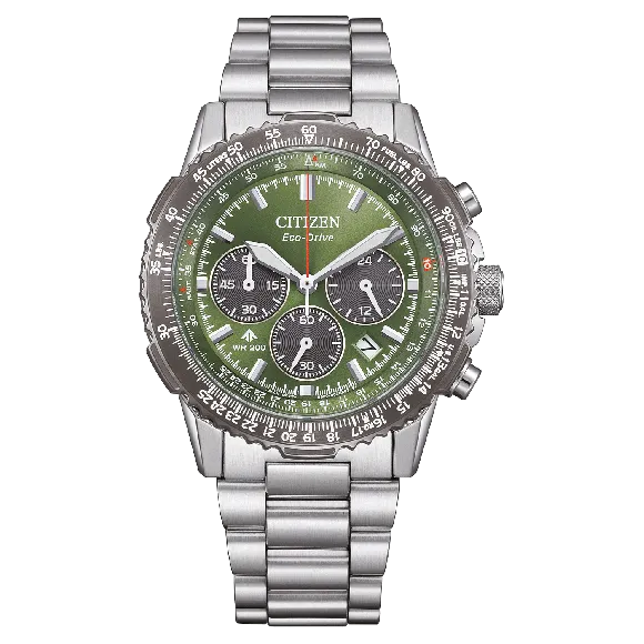 Introducing the Citizen® Chronograph 'Promaster Air Navihawk' Men's Watch CA4664-60W, a sophisticated choice for the modern man. With its sleek silver stainless steel case and band, it exudes an aura of luxury and professionalism. The 40mm round case is designed to withstand the rigors of daily wear, while the 13mm thickness adds just the right amount of presence on the wrist without feeling cumbersome. This timepiece is water-resistant up to 20 bars, making it not only stylish but also practical for those who lead an active lifestyle. The striking green dial is a delightful contrast against the polished silver tones, featuring luminous hands that ensure readability even in low-light conditions. The watch also hosts a date calendar, handy for daily planning. A turnable bezel enhances its functionality, allowing for precise timing during activities that require more than just telling time. Plus, the chronograph display adds a sporty edge, appealing to those who appreciate both elegance and practicality. As a solar-powered model, this watch features Eco-Drive technology, meaning it converts light into energy, eliminating the need for battery replacements. Perfect for adventurous souls or the professional on the go, the watch band measures 21cm in length and 21mm in width, secured with a fold-over clasp, ensuring a snug fit for any wrist size. Its robust design is not just about looks; it's engineered to keep up with your lifestyle, making it an essential accessory for men who value performance and style.