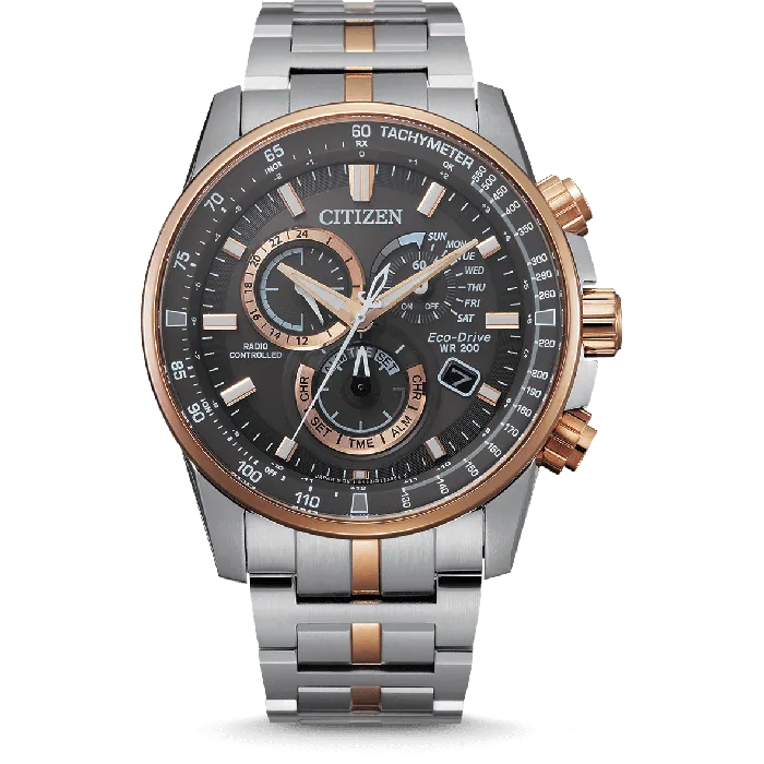 Introducing the Citizen® Chronograph 'Promaster Sky' Men's Watch CB5886-58H, a remarkable piece designed for the discerning gentleman. This stunning pilot watch boasts a 42mm stainless steel case, crafted to withstand the rigors of adventure, blended seamlessly with aesthetic appeal. The round case is finished in a striking multicolor, making it a fashionable yet durable choice for daily wear or special occasions. The grey dial, protected by sapphire glass, offers both elegance and clarity, ensuring that timekeeping is effortless and precise at a glance. Additionally, the watch features a robust yet comfortable multicolor stainless steel band, measuring 21cm in length and 21mm in width, secured with a reliable fold-over clasp with a push-button mechanism. One of the most impressive attributes of this timepiece is its Eco-Drive technology, which harnesses light to keep the watch powered, eliminating the need for battery changes. It's not just eco-friendly; it's also equipped with a chronograph display that allows for precise timing, making it perfect for the aviator in you. The watch is also radio-controlled, ensuring accurate timekeeping no matter where you are in the world, and features a tachymeter for measuring speed. With a water resistance of up to 20 bars, this watch is built for those who are not afraid to get their hands wet. The day-date calendar feature keeps you organized, while the stopwatch function provides added convenience for various activities. Whether in the cockpit or on solid ground, this exceptional timepiece is ready for anything.Shop Citizen CB5886-58H at Ormoda