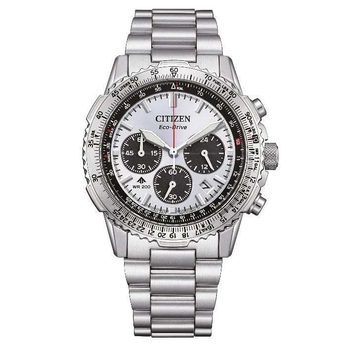 The Citizen® Chronograph 'Promaster Sky Navihawk' Men's Watch CA4660-61A is more than just a timepiece; it's a symbol of innovation and sophistication. Designed with the modern man in mind, this remarkable watch features an Eco-Drive movement that harnesses light to power its intricate functions, ensuring you'll never need a battery replacement. Its 40mm round stainless steel case not only provides durability but also exudes a polished elegance that can seamlessly transition from a business meeting to an outdoor adventure. The turnable bezel enhances its functionality, making it ideal for aviation enthusiasts and globetrotters alike. The watch showcases a striking silver dial protected by sapphire glass, renowned for its scratch resistance and clarity. With luminous hands and a chronograph display, tracking time has never been easier, allowing you to keep an eye on every adventure. This model also includes a convenient date calendar, lending practicality to your busy lifestyle. The watch band, crafted from high-quality stainless steel, is designed to withstand the rigors of everyday wear while maintaining a sleek appearance. With a length of 21cm and a width of 21mm, it ensures a comfortable fit. With a water resistance of 20 bars, the Citizen® Chronograph 'Promaster Sky Navihawk' is ready for any challenges you may face, whether you're diving into the ocean or caught in a rainstorm. Weighing in at just 165 grams, it's ergonomically designed for daily use without compromising on style. This timepiece symbolizes not just the passage of time but moments of life well-lived, making it a perfect addition to any man's collection.Shop Citizen CA4660-61A at Ormoda