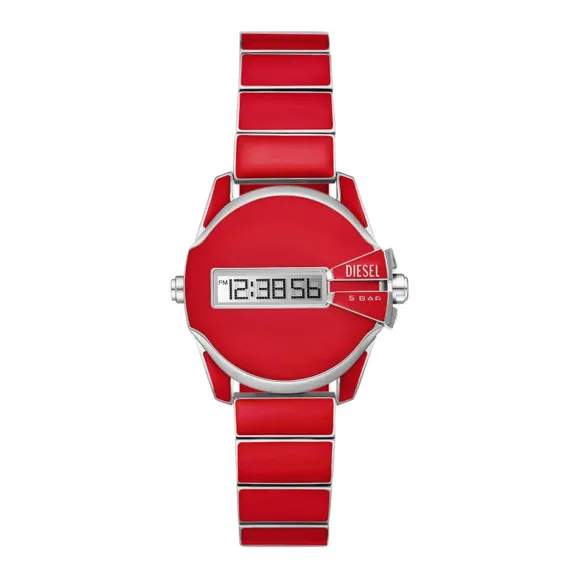 The Diesel® Digital 'Baby Chief' Men's Watch DZ2192 is more than just a timepiece; it's a statement of individuality and style. Designed for the modern man who values both functionality and aesthetics, this watch combines a vibrant red color scheme with quality craftsmanship. The round stainless steel case, measuring 32mm in diameter and 9mm thick, houses a bold red dial that features a digital display, perfect for those who appreciate innovative design. Underneath the mineral glass window, the day-date calendar function enhances practicality in daily use. The watch securely fits on your wrist thanks to the robust stainless steel band, extending up to 21cm in length and 18mm in width. Its fold-over clasp with a push-button ensures both comfort and security, making it ideal for everyday wear. With a water resistance capability of up to 5 bars, this watch stands up to the rigors of daily life without compromising on style. The unique multicoloured styling of the case adds an edgy twist, allowing you to express your personality. Weighing just 102 grams, it is lightweight and comfortable for all-day wear. This casual watch artfully combines sportiness with chic elegance, making it versatile for various occasions, whether you are at work or enjoying a night out. The Diesel Baby Chief is the perfect accessory for the man who dares to be different. Experience the perfect fusion of form and function with Diesel, where every detail is crafted to meet and exceed your expectations.Shop Diesel DZ2192 at Ormoda
