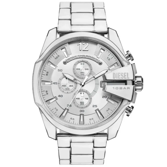 The Diesel Chronograph 'Mega Chief' Men's Watch DZ4660 is a stunning example of modern craftsmanship and bold design. Renowned for infusing youthful energy into classic styles, Diesel is a brand that stands out with a flair for the edginess and sophistication required by today's discerning customers. The Mega Chief collection is built for the man who appreciates robust aesthetics without compromising on performance. With its striking 51mm stainless steel case in a dignified silver tone, this watch is not just a timepiece; it’s an expression of individuality and confidence. The round case, coupled with a sleek mineral glass dial window, ensures durability while maintaining an upscale look that can easily transition from daytime adventures to evening sophistication. This timepiece is equipped with a precise quartz movement, ensuring accuracy that meets the demands of modern life. The silver dial offers a perfect canvas for the chronograph features, providing an ideal balance of functionality and elegance. Additional elements include a date calendar conveniently located on the dial, enhancing usability. The watch features a sturdy 14mm thick case, designed to withstand pressures of up to 10 bars, making it suitable for a variety of activities. For added comfort and style, the white stainless steel band, which measures 21cm in length and 26mm in width, blends seamlessly with the overall aesthetic. The fold-over clasp with a push button ensures a secure fit, allowing for ease of wear throughout the day. This watch articulates style with substance, perfect for men who desire a piece that reflects their lifestyle and aspirations.Shop Diesel DZ4660 at Ormoda