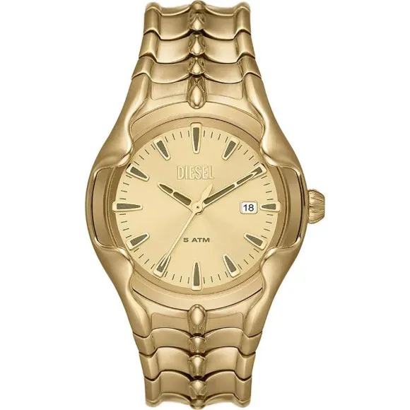 Introducing the Diesel® Analogue 'Vert' Men's Watch DZ2186, a true masterpiece for discerning gentlemen who appreciate the intersection of style and function. Boldly designed, the Vert showcases a stunning gold hue that effortlessly elevates any casual ensemble. Its robust build features a round stainless steel case with a thickness of 11mm, complemented by a striking gold dial that promises to catch the light in the most flattering ways. With a case diameter of 44mm, this timepiece commands attention, making it a perfect accessory for both day and night outings. The watch is powered by a precise quartz movement, ensuring reliable timekeeping when it matters most. Adding to its allure, the watch is fitted with a durable mineral glass window that protects the dial from everyday scratches and marks, keeping it looking pristine over time. The gold stainless steel band, measuring 21cm in length and 24mm in width, offers a comfortable fit that's easy to adjust. A fold-over clasp with a push-button mechanism provides added security while maintaining the sleek aesthetic of this luxury watch. Moreover, the Diesel Vert offers practical features such as a date calendar and a water resistance rating of up to 5 bars, making it suitable for daily wear in various conditions. With a weight of 178 grams, this piece strikes the right balance between substantial and manageable on the wrist. Combining functionality with a fashionable edge, the Diesel 'Vert' is the perfect companion for the modern man who values craftsmanship and contemporary design.