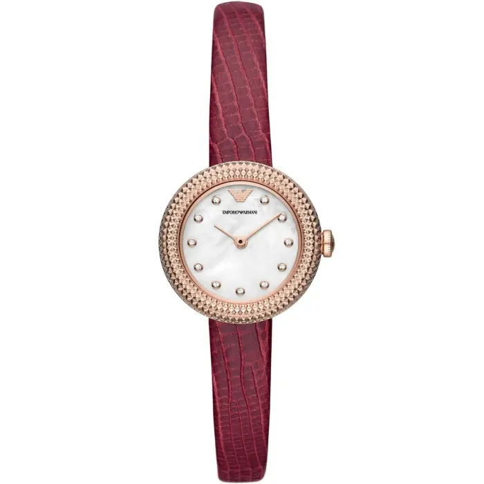 Emporio Armani® Analogue 'Cleo' Women's Watch AR11417 radiates elegance and sophistication, making it the perfect companion for any occasion. This dress watch enchants with its round stainless steel case, coated in a stunning rose gold hue. With a diameter of 26mm and a thin profile at 6mm, it rests gracefully on the wrist, ensuring comfort without sacrificing style. The exquisite mother of pearl dial adds a touch of luxury, subtly catching the light throughout the day. Complementing the dial is a sophisticated leather band in a captivating shade of red, measuring 19cm in length and 10mm in width, catering to a variety of wrist sizes. The traditional buckle clasp guarantees a secure fit, allowing you to focus on what truly matters. This quartz movement timepiece is designed for the modern woman who appreciates both functionality and fashion. With an impressive water resistance of up to 3 bars, it's as practical as it is beautiful. Weighing in at just 21g, it feels delightfully lightweight, making it easy to wear from morning meetings to evening outings. The Emporio Armani® Analogue 'Cleo' Women's Watch is a timeless addition to any jewelry collection, embodying a chic yet approachable style that women of all tastes can embrace.