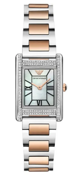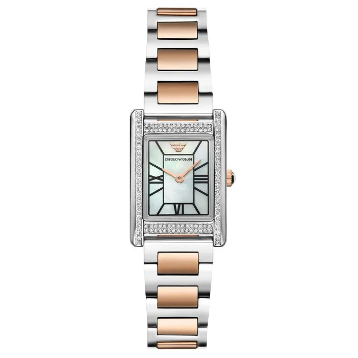 Indulge in the luxurious elegance of the Emporio Armani Analogue 'Genni' Women's Watch AR11626, a symbol of sophisticated style that seamlessly complements both casual and formal attire. Designed for the modern woman, this stunning timepiece features a beautiful rectangular case, crafted from high-quality stainless steel with a polished silver finish. At a modest size of 23mm in length and 22mm in width, it sits delicately on the wrist, accentuating femininity and grace. The watch's mother of pearl dial radiates luminosity, enhanced by the precision of quartz movement, ensuring that you keep time with both accuracy and style. The 'Genni' exemplifies luxury not just in its aesthetic but also in its functionality. With stone settings adorning the bezel, this watch adds a touch of glamour to every glance, captivating onlookers. The mineral glass window provides robust protection, ensuring durability without compromising elegance. Its multicolour stainless steel band, measuring 19cm in length and 16mm in width, is designed for comfortable wear, while the deployment clasp allows for easy fastening and a secure fit. With an impressive water resistance of up to 5 bars, this timepiece is well-suited for the demands of daily life. Whether you're attending a gala or enjoying a sunny brunch, the Emporio Armani Genni keeps you looking and feeling fabulous. Elevate your accessory collection with this exquisite watch, perfectly embodying the essence of femininity and modern luxury. Shop Emporio Armani AR11626 at Ormoda