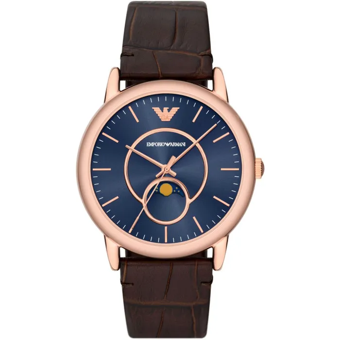 Introducing the Emporio Armani® Analogue 'Luigi' Men's Watch AR11566, a striking piece that embodies sophistication and elegance. Specifically designed for the distinguished man, this watch features a round watch case crafted from durable stainless steel, finished in a charming rose gold hue. Measuring 43mm in diameter and 10mm in thickness, it's not just a timepiece; it's a statement accessory that draws attention without overwhelming your style. The meticulous attention to detail echoes Emporio Armani's commitment to quality and luxury. The watch face displays a rich blue color that beautifully contrasts with the rose gold casing, enhancing readability while adding an element of depth to your look. Underneath the durable mineral glass, an analogue display captures the essence of classic watchmaking, complemented by a date calendar that caters to the modern gentleman's lifestyle. The timepiece is powered by a reliable quartz movement, ensuring precision with every tick. A luxurious brown leather band adds a touch of warmth and sophistication, measuring 22mm in width and 21cm in length, and secured by a classic buckle clasp. This combination not only enhances comfort but also reinforces the watch's upscale aesthetic. With a water resistance rating of up to 5 bars, the Emporio Armani Luigi watch is designed for life's adventures, both elegant and everyday. Experience style and functionality seamlessly combined in this exquisite timepiece that every modern man deserves.
