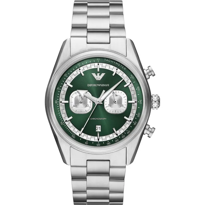 The Emporio Armani® Chronograph 'Racer' Men's Watch AR11637 is a striking example of luxury and performance that embodies the brand's spirit. Crafted for the modern man, this watch features a robust 42mm round stainless steel case that emphasizes both durability and style. With a sleek silver case and a bold green dial, it creates a perfect contrast that captures attention without overwhelming. The mineral glass dial window will protect your watch from scratches while allowing the luminous hands to shine brightly, even in low-light conditions. The chronograph display adds a sporty edge and is complemented by a tachymeter, enhancing its functionality for those who appreciate precision timing. A deployment clasp ensures a secure fit while remaining easy to wear, making this watch an ideal companion for both athletic pursuits and everyday wear. With a water resistance of 5 bars, you can dive into your adventures without worrying about the watch's safety. The stainless steel band is not only stylish but also comfortable, with a length of 21cm that accommodates a range of wrist sizes. Every detail, from the intricate stopwatch functionality to the calendar feature, exemplifies the luxury that Emporio Armani brings to watchmaking, making the Racer a must-have for any discerning gentleman. Whether you are headed to the office or out for a night on the town, the Emporio Armani Chronograph 'Racer' adds a touch of elegance to every outfit. It's not just a watch; it's a refined statement of your taste and lifestyle.