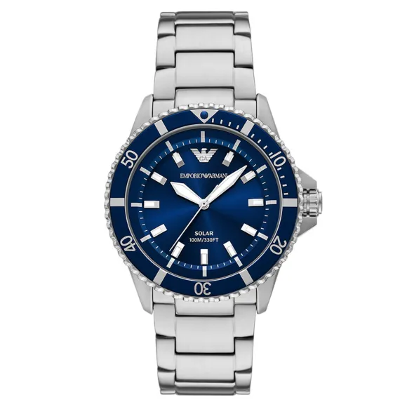 The Emporio Armani® Chronograph 'World Explorer' Men's Watch AR11697 is a statement piece tailored for the modern gentleman. This timepiece features a sturdy stainless steel construction that embodies both durability and style. The silver case, with a diameter of 43mm and a thickness of 13mm, creates a bold presence on the wrist. Its blue dial is accentuated by luminous hands and numbers, ensuring readability even in low-light conditions. The chronograph display adds functionality, perfect for the man who appreciates precision and multitasking in his daily adventures. Equipped with a turnable bezel, this watch provides added versatility, allowing you to track time zones or make calculations on the fly. The watch is powered by a reliable quartz movement, known for its accuracy and low-maintenance requirements. At 10 ATM water resistance, the Emporio Armani 'World Explorer' is ready for spontaneous adventures, be it a swim or a daring trek. The watch is paired with a silver stainless steel band, measuring 21cm in length and 21mm in width, secured with a fold-over clasp with a push button for ease of use. Its total weight is a comfortable 113 grams, ensuring that it feels as good as it looks. Designed for the discerning gentleman, this timepiece seamlessly transitions from professional settings to casual outings, making it an indispensable addition to any watch collection.Shop Emporio Armani AR11697 at Ormoda
