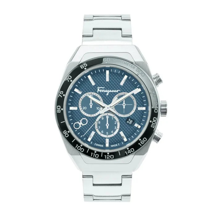 Experience precision and style with the Ferragamo® Chronograph 'Slx' Men's Watch SFHR00420. Crafted for the modern man, this timepiece features a striking blue dial that effortlessly combines functionality with high-end design. The sturdy stainless steel case, measuring 42mm in diameter and 11mm in thickness, provides both durability and elegance, while the round shape ensures a classic appeal that fits any occasion. Equipped with a tachymeter, this watch is perfect for those who appreciate advanced timing capabilities in a sporty format. The watch is powered by a precise quartz movement, ensuring accuracy whether you’re at the office or the track. With a handsome silver color scheme, both the case and the band are made from high-quality stainless steel, which is not only stylish but also built to withstand daily wear. The deployment clasp secures the watch firmly on your wrist, making it comfortable for everyday use or special events. In addition to its stunning aesthetics, the Ferragamo® Chronograph 'Slx' is designed for functionality, featuring luminous hands and numbers for easy readability in all light conditions. A date calendar adds a practical touch to the already impressive timepiece. With water resistance up to 5 bars, this watch can keep up with an active lifestyle, combining sport and luxury. An ideal choice for men who value both craftsmanship and sophistication, this watch is a statement piece that will elevate your accessory game.